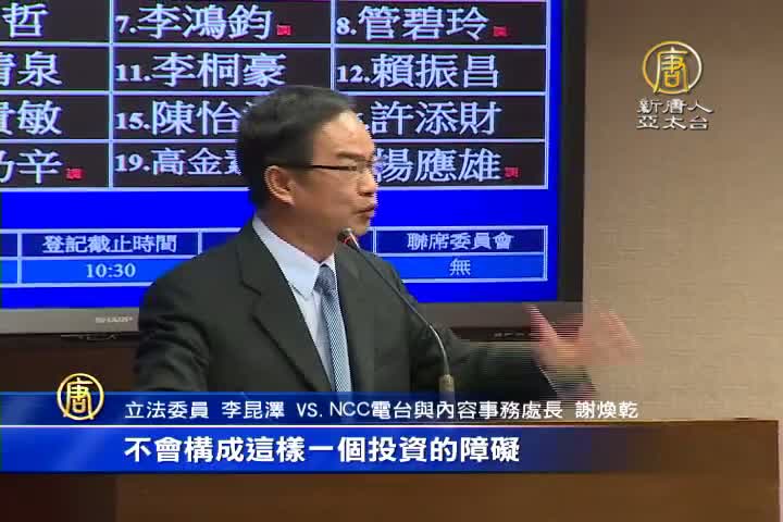 立法委員 李昆澤 VS.國家通訊傳播委員會電台與內容事務處長 謝煥乾:「這個創辦人來跟你們會面之後,他就很有信心的說,他與中國大陸的關係,不會構成這樣一個投資的障礙,你們到底跟人家談什麼。沒有他就是,跟委員 報告就是只了解國內對於這個外資,如果來入股我們的頻道事業的時候,應該遵守那些規定而已。」