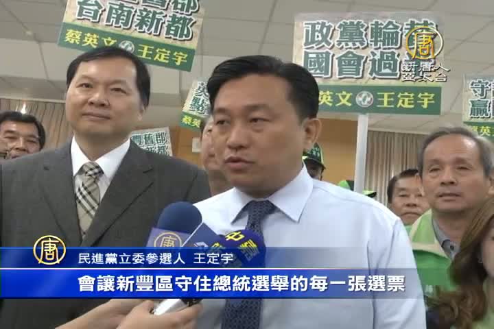 【新唐人亞太台 2015 年 11 月 24 日訊】接著來看到台南,今天台南立委選舉登記,包括第一次參選立委的第五選區王定宇,第四選區國民黨現任不分區立委陳淑慧,還有綠黨社會民主黨聯盟也推出楊智達參選。