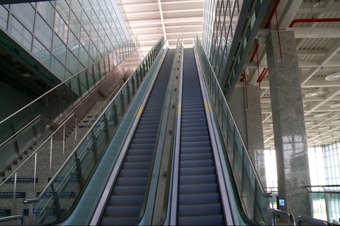 建築立面明亮簡潔的苗栗高鐵站,象徵客家儉僕,堅毅硬頸的精神,玻璃融入油桐花意象,挑高5層樓,視野廣闊,總長度31.9公尺的手扶梯,可從2樓直通5樓,是目前所有車站最長的電扶梯。