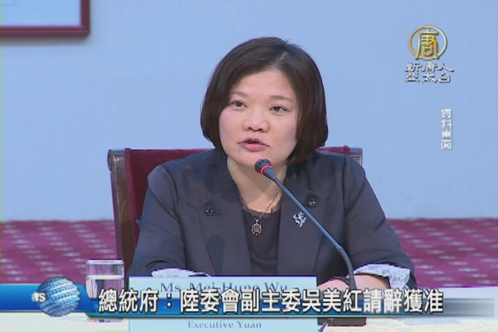 【新唐人亞太台 2015 年 11 月 24 日訊】總統府晚間發布人事令,陸委會副主委吳美紅 請辭獲准,從12月2日生效。日前舉辦馬習會時,吳美紅也是我方7人代表之一,今天傳出突然請職獲准,請辭原因引發各方揣測。