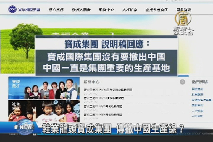 【新唐人亞太台 2015 年 11 月 25 日訊】財經消息,來看到。年營收超過2700億的全球鞋業代工龍頭寶成集團,被周刊爆料,將退出中國市場,把生產線拉回台灣,原因是中國實行「五險一金」後,營運成本大增,不過對於這個說法,寶成集團今天發聲明否認。