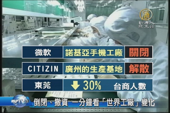 除了企業倒閉、外資也加緊關廠、撤離,微軟今年初關閉位於北京及東莞的諾基亞手機工廠;鐘錶企業CITIZIN在今年中國新年前,宣布清算解散在廣州的生產基地。