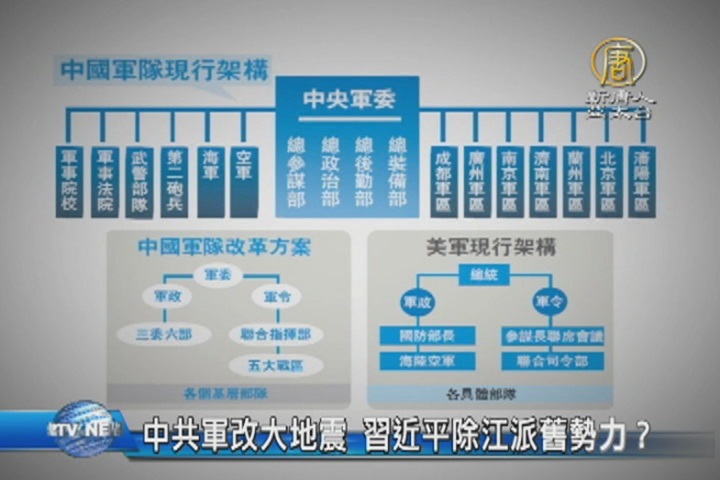 【新唐人亞太台 2015 年 11 月 26 日訊】香港《南華早報》披露,中國軍隊改革本週二啟動。方案中,現有七大軍區將整編為四大戰略區,現有四大總部只有總參謀部存留。北京當局希望藉軍改,打造一支現代化軍隊。而外界關注,中國軍隊「黨衛軍」的性質,何時會改變。