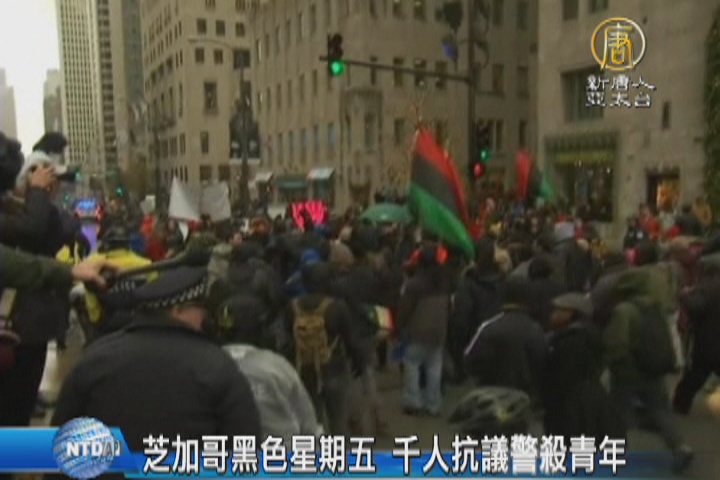 【新唐人亞太台 2015 年 11 月 28 日訊】感恩節過後,是俗稱「黑色星期五」(Black Friday)的傳統購物日。可是在芝加哥最繁忙的購物區,憤怒的情緒卻掩蓋了歡樂氣氛。有數千人上街遊行,堵塞街道、百貨公司和商店的入口,抗議白人警察連開16槍,擊斃一名黑人青年的事件,並要求當局正視警察執法過當的問題。