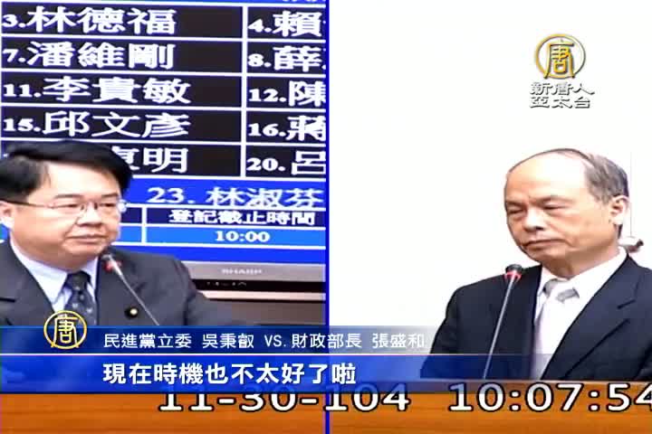 【新唐人亞太台 2015 年 11 月 30 日訊】歡迎回來。財政部長張盛和,提出了稅改的措施,要幫綜所稅擴大扣除額,這等於幫一般受薪階級和弱勢來減稅,但是幫有錢人加稅,最快在下個會期就會提出,2016年報 稅的時候可能可以就適用,不過在選前拋出稅改,被綠營質疑是在騙選票,但張盛和說成功不一定在我,新的財長上台後才通過也可以。