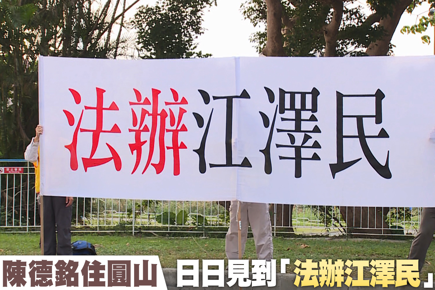 法輪功學員:「法輪大法好,停止迫害法輪功」台北法輪功學員 蔡先生:「要中共立即停止迫害法輪功的心聲,帶回中國大陸,要法辦江澤民的心聲,帶回中國大陸,這是我們今天來這裡的主要目的」法輪功學員每天一早,在陳德銘離開圓山飯店的時候,一定出現在圓山飯店的山腳下,拉著橫幅,高呼停止迫害的口號。學員們說,今年七月開始,全亞洲聲援停止迫害、要求法辦江澤民的舉報聯署,已經來到77萬,他們希望習近平當局正視這個聲音,呼應海內外的民意,結束迫害、法辦元凶。