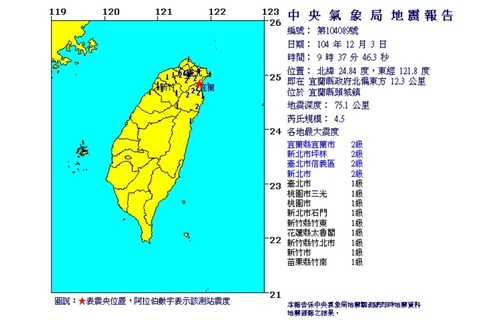 【新唐人亞太台 2015 年 12 月 03 日訊】中央氣象局表示,今天(3日)上午9時37分,宜蘭縣頭城鎮發生芮氏規模4.5地震,地震深度為75.1公里,各地最大震度為宜蘭縣市、新北市坪林、台北市信義區、新北市都2級。