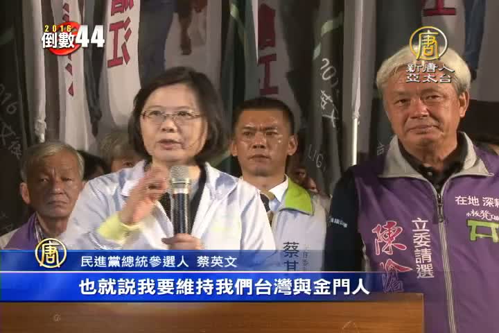 【新唐人亞太台 2015 年 12 月 03 日訊】民進黨總統參選人蔡英文連續兩天在金門造勢。昨天(3)晚間,民進黨立委參選人陳滄江競選總部成立晚會上,蔡英文猛打兩岸穩定牌,搶攻國民黨票倉。