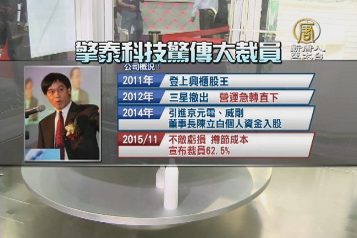【新唐人亞太台 2015 年 12 月 03 日訊】曾獲英特爾、三星等半導體大廠入股、在2011年時 股價衝上300元,一度登上興櫃股王的儲存型快閃記憶體(NAND Flash)控制晶片廠擎泰,驚傳裁員約七成,明年3月,只剩下18多名員工,震撼記憶體業界。