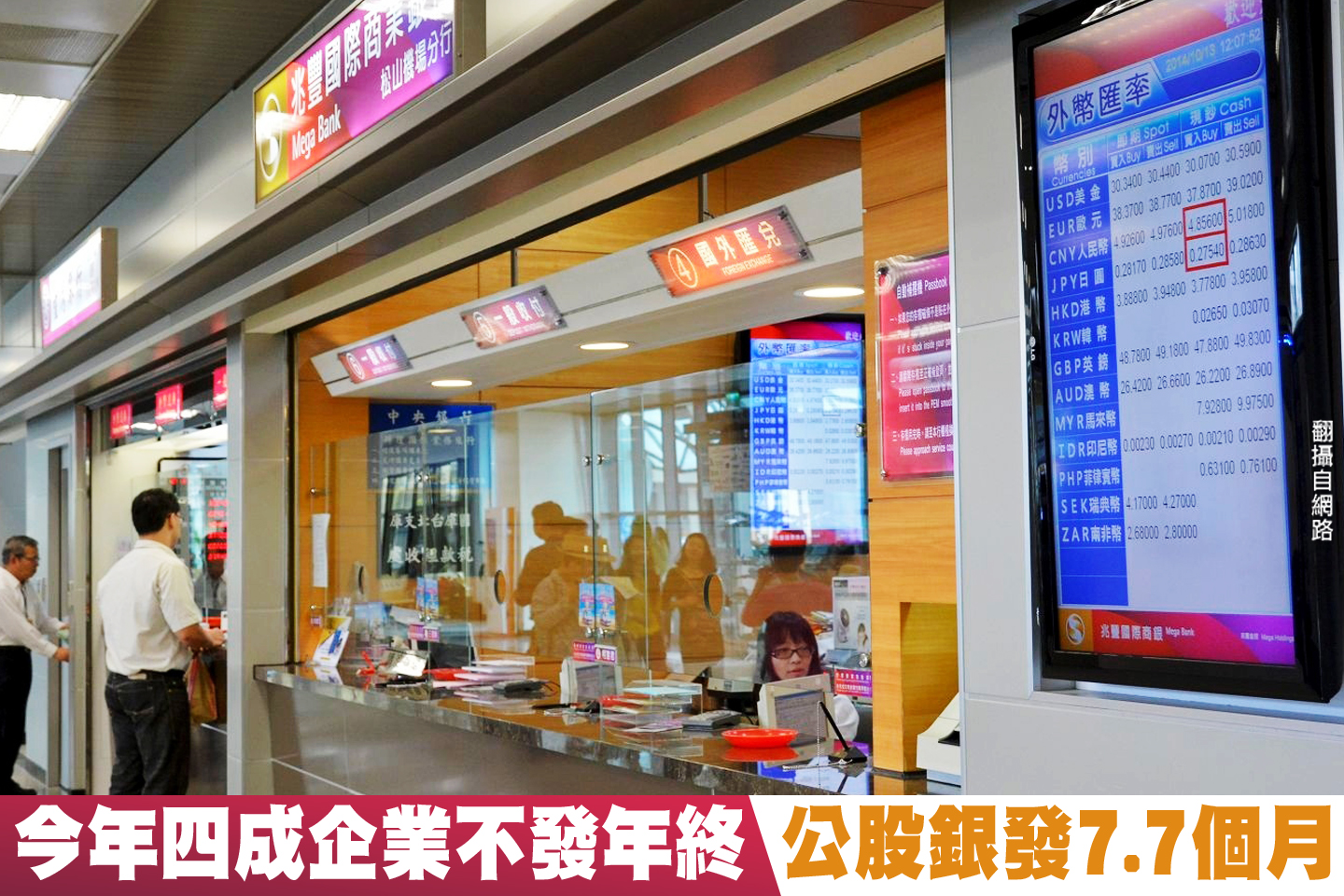 包括營建、傳產、電子業年終都可能縮水。不過,金融業年終平均來到2.13個月,平面媒體報導,公股兆豐銀行,年終最多可領7.7個月。