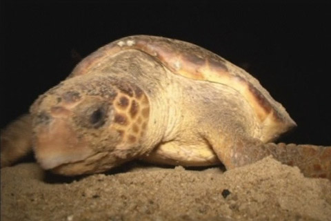 「這是一隻海蠵龜,學名叫caretta caretta。牠在今天被發現並做記號,之前沒有被做過記號。牠剛剛產卵,是這一帶典型的海龜,尤其是沿著聖埃斯皮里圖州海岸線及這一帶的海灘。」