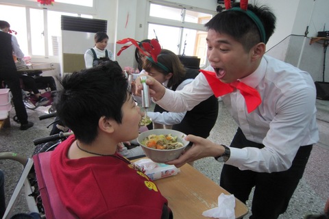 二林喜樂保育院院長林玉嫦表示,感謝弘光科技大學的師生,將聖誕愛餐送進喜樂保育院,看到同學們著廚師裝烹煮美食,餐旅系服務人員以專業提供貼心服務,在聖誕佳節帶給慢飛天使的關懷,不只溫暖了院生的心,也讓『慢飛天使』提早過溫馨的聖誕節。