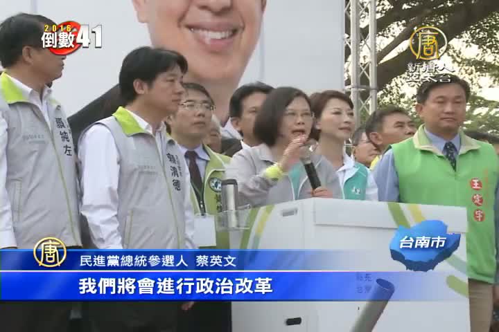 【新唐人亞太台 2015 年 12 月 06 日訊】民進黨參選人蔡英文台南競選總部,今日下午舉行成立大會,明年1月3日在新營舉辦農漁林牧大會師造勢晚會,投票前還有一場團結造勢大會, 「三步曲」衝高台南選票,努力朝「全國最高得率」目標邁進。