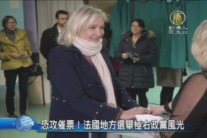 【新唐人亞太台 2015 年 12 月 07 日訊】繼續來看到,法國,在昨天(6日)舉行首輪的地方選舉,由於三周前的巴黎恐攻,發揮助選效應, 讓立場極右、反移民的「民族陣線」領先所有政黨,候選人得票率,在全國新畫的13個選區中的六個居冠,前總統沙克吉領導的共和黨得票率排第二。現任總統歐蘭德的社會黨排第三。