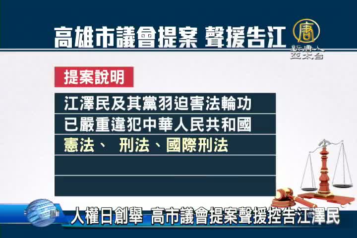 【新唐人亞太台 2015 年 12 月 09 日訊】聲援中國民眾控告江澤民的大潮持續延燒!國際人權日前,高雄市議會由國民黨與民進黨議員提案及連署,聲援中國民眾依法控告迫害法輪功的元兇 江澤民,並呼籲中國政府依其對國際社會所宣示的「依法治國」政策,立即停止迫害法輪功團體。這項人權提案,是華人社會中第一個縣市議會,聲援中國法輪功學員爭取基本人權及司法正義的創舉。