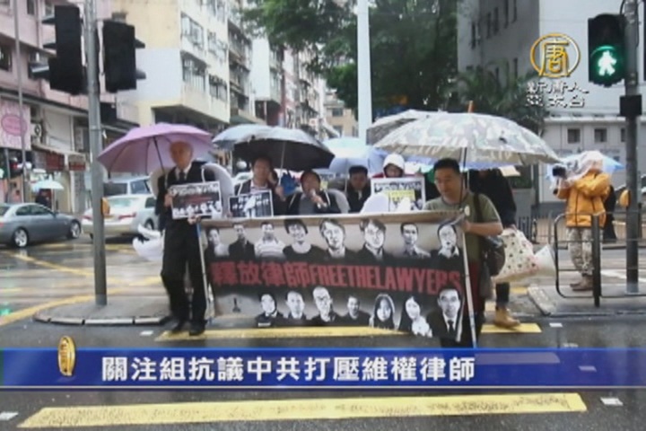中國維權律師關注組和支聯會等團體舉行「為天使重奪自由」抗議行動,十多名成員冒雨從西區警署遊行到中聯辦,團體批評中共今年7月9日凌晨開始大規模抓捕維權律師人士,至少24省307人受到影響,至今仍有41人被秘密羈押或強迫失蹤。許多被拘維權律師長期數月杳無音訊,更被以莫須有罪名被控入罪。