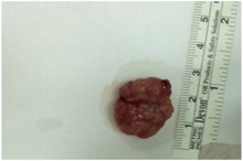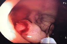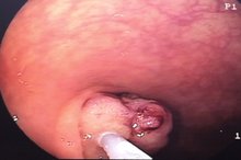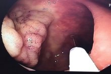 醫生操作時將一根導管與攝像儀探入大腸內,以查看大腸內部的狀況。圖為內視鏡光源照射瘜肉組織外觀(衛福部朴子醫院提供)