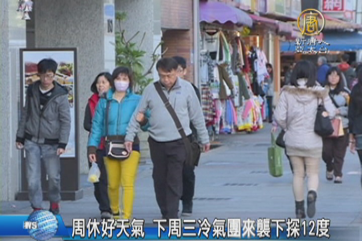 【新唐人亞太台 2015 年 12 月 11 日訊】想出遊的民眾可得好好把握這個周末了,氣象局預報,這個周末天氣相當不錯。不過從下週三開始,又有新一波冷氣團來報到,最冷將出現在下周三晚上到下周四上半天,北部最低溫將下探到12度,中南部地區低溫也只有14到16度。