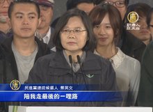 2016-01-16 02:12:38選前之夜,民進黨總統候選人蔡英文 在總統府前凱達格蘭大道舉辦造勢活動,現場湧入10萬民眾冒雨參加,蔡英文說,對立牌及恐嚇牌已經無用,中華民國不會因誰當選而滅亡,感謝支持者陪她走完這最後一哩路。