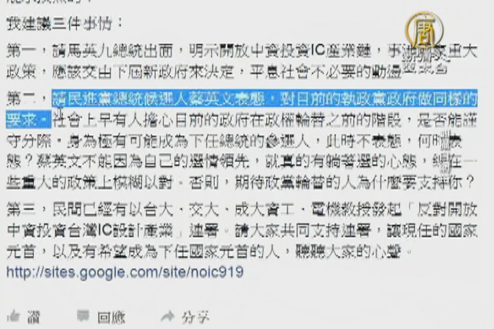 【新唐人亞太台 2015 年 12 月 14 日訊】中資投資IC產業鏈,引發反彈,前國策顧問郝明義在臉書上呼籲總統馬英九放手、民進黨主席蔡英文表態,郝明義說,請總統馬英九出面,明示開放中資投資IC產業鏈,事情涉及國家重大政策,應該交由下屆新政府來決定,平息社會不必要的動盪。他還說,請民進黨總統候選人蔡英文表態,如果總在一些重大的政策上模糊以對,期待政黨輪替的人為什麼要支持你?