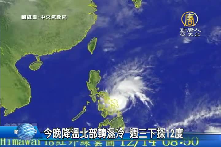 【新唐人亞太台 2015 年 12 月 14 日訊】氣象局表示,今天白天台灣各地大多是多雲到晴的天氣,不過到了晚上,東北季風開始增強,溫度將逐步下滑,北部降雨機率將提高,預計這波大陸冷氣團最低溫將落在週三晚上到週四清晨,中部以北低溫可能降到12到14度,南部低溫約15度左右,一直到週六溫度都偏低,提醒觀眾朋友要提早做好防寒準備。