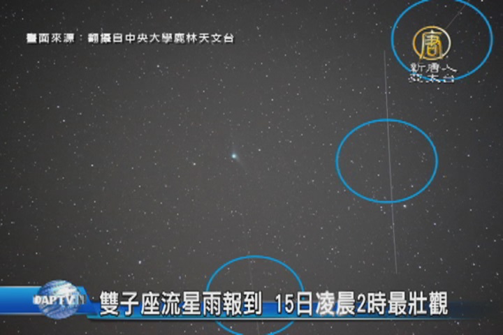 【新唐人亞太台 2015 年 12 月 14 日訊】要許願的觀眾可得把握今晚囉,雙子座流星雨今晚報到,從晚間9點到明天清晨天亮前,在無光害空曠地區朝東方觀察都可看到,15日凌晨2點流星數量最多,每小時最高可達120顆。台灣親子觀星會聯合九個轉播站,也將進行聯合轉播,如果天氣和訊號好的話,只要打開轉播網頁,不只可以看見流星,還可以聽到流星的電波訊號!