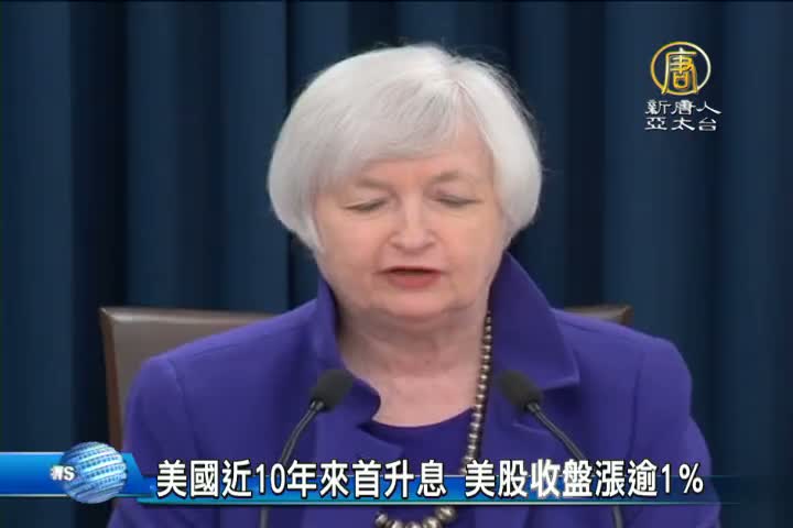 【新唐人亞太台 2015 年 12 月 17 日訊】早安新唐人帶您看到,美國聯準會在台北時間凌晨宣布,近10年來首次升息一碼,不出市場所料,美國聯準會宣布,利率調高為0.25%到0.5%,並暗示明年會升息四碼,聯準會還公布美國明年GDP預測來到2.4%,失業率則下調到4.7%。消息激勵美股走強,美國3大指數,今天收盤漲幅都超過1%。