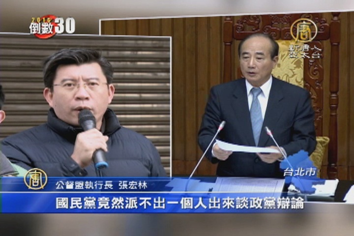 公督盟執行長 張宏林:「他們竟然沒有人找不出人來辯論,一個這麼大的政黨,一個主席號稱以國會改革著稱,一個我們看到的他排第一名的是,連任好幾十年的立法院院長,國民黨竟然派不出一個人出來談政黨辯論,這是多麼羞恥的事情。」