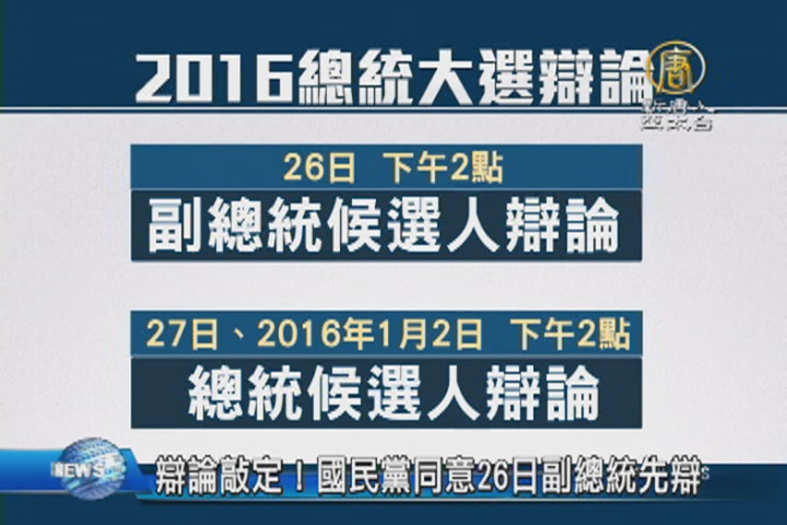 【新唐人亞太台 2015 年 12 月 18 日訊】新聞頭條,先來看到,2016總統大選的辯論,終於敲定了。國民黨文傳會主委林奕華今表示,國民黨願意同意民進黨所提電視辯論順序,26日先進行副總統辯論。 國民黨、民進黨、親民黨以及9家媒體代表,今天下午,終於達成共識,敲定2016總統選舉辯論,26日下午2時先進行副總統候選人辯論,27日與明年1月2日下午2點,進行總統候選人辯論。