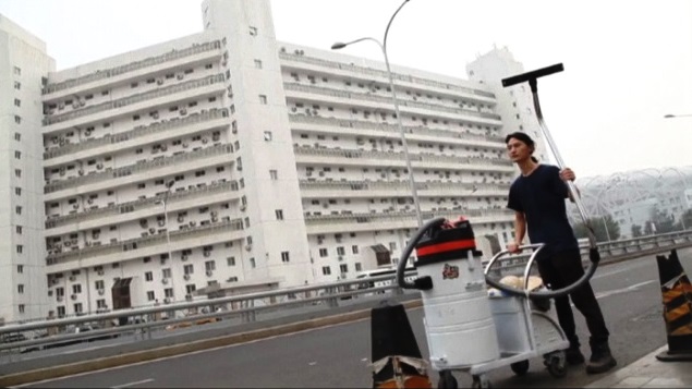 在12月1日巴黎氣候峰會召開,同時北京市空氣品質一直在「橙色」及「紅色」警報遊走。畫面上可以看到這位自稱堅果兄弟的行動藝術家王任征,拖著直立圓筒型的大型吸塵器,走在北京的大街小巷,收集霧霾中的塵埃。