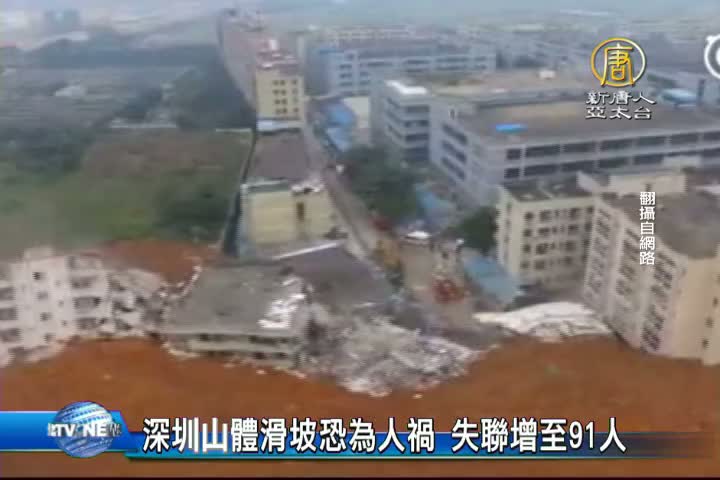 【新唐人亞太台 2015 年 12 月 21 日訊】中國廣東深圳光明新區昨天(20日)中午發生嚴重山崩,官方消息宣稱,截至今天上午9點,失聯人數急劇上升到91人,搜救行動還在持續進行中,當地官媒在微博揭露事故原因是人禍,初步斷定是臨時淤泥受納場違規作業,而受納場 是原光明新區城管局長徐遠安等人批准的,但是這2則發文,隨後馬上遭到刪除。