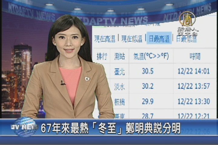【新唐人亞太台 2015 年 12 月 22 日訊】今天是冬至,但根據氣象局的觀測資料,台北下午2點攝氏30.5度,創下67年來冬至最高溫,其次是淡水30.2度、板橋29.9度,氣象預報中心主任鄭明典在臉書貼文表示,會這麼熱,是因為高壓迴流的天氣,南方相對暖濕的空氣籠罩台灣的緣故!
