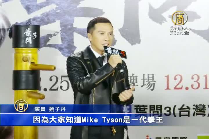 2016-09-28 13:42:32《葉問3》(Ip Man 3)2015年底上映。在香港和台灣的首映會上,功夫巨星甄子丹帶著妻子兒女一同步上紅毯。 本集重頭戲之一,和拳王泰森對打,成為媒體焦點話題。