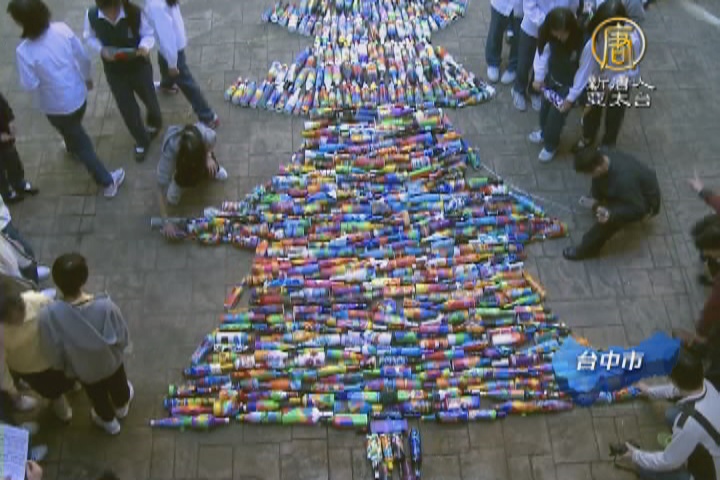 【新唐人亞太台 2015 年 12 月 22 日訊】聖誕節即將到來,台中市曉明女中497名國中部學生,在美術老師的指揮下,每人手持自己彩繪的回收玻璃瓶,拼出長7公尺、寬4公尺的環保聖誕樹,提前歡慶聖誕節。