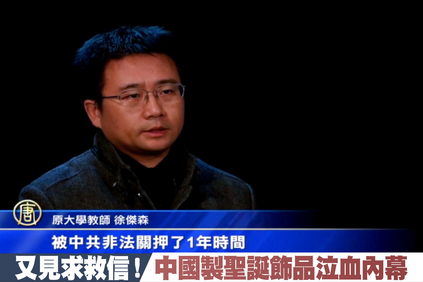 傑森:「基本不需要付1分錢的人工報酬。為甚麼呢?當時我是因為堅持修煉法輪功,被中共非法關押了1年時間,當時在看守所裡面警察就逼迫我們生產這種聖誕小彩燈還有一些其他的外貿產品。我們每天要做好幾十套,到後來因為插這個彩色小燈泡,手就被磨破了,出血化膿。但就這樣子還得要生產。」