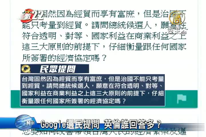 【新唐人亞太台 2015 年 12 月 25 日訊】這週末,將舉行副總統與總統辯論,兩個月前,Google推出「2016 總統大選」網站,讓選民向總統候選人提問。根據Google數據,目前大家最關心的,還是經濟議題,占了五分之一。