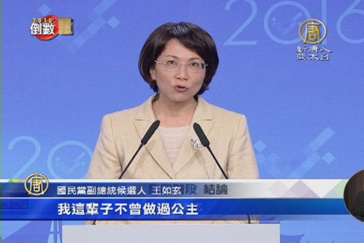 【新唐人亞太台 2015 年 12 月 26 日訊】副總統辯論今天(26)舉行,國民黨副總統候選人王如玄一開頭就為軍宅爭議鞠躬道歉,辯論過程中,王如玄說自己一路走來始終如一,為婦女議題奔波,談到勞工s二代出身,從來沒有「公主命」時,還不禁哽咽。