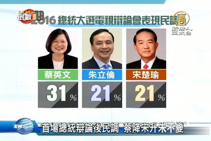 【新唐人亞太台 2015 年 12 月 28 日訊】2016大選倒數19天,昨天舉行了第一次總統電視辯論。三位候選人的表現,根據聯合報的最新民調,有31%的民眾認為蔡英文的表現比較好,不過,英仁配的支持度,雖然還是遙遙領先,但比起之前,降了2個百分點,來到39%