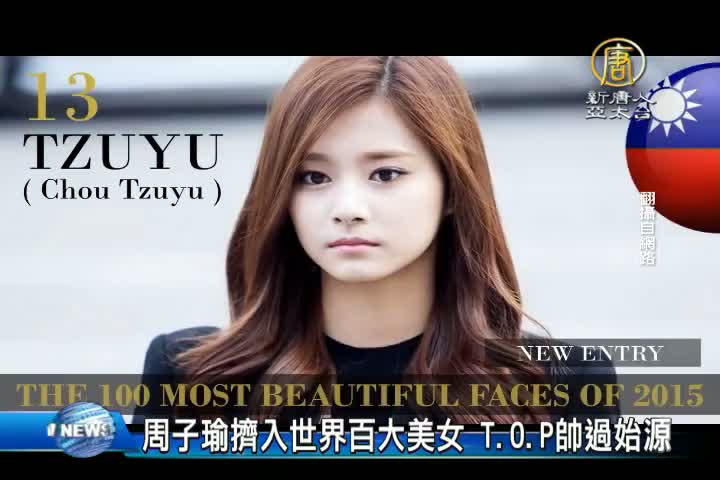 【新唐人亞太台 2015 年 12 月 28 日訊】台籍韓星周子瑜,首度入選美國「TC Candler」電影網站「世界百大美女榜」,排名第13,是唯一的台灣代表。另外在全球百大帥哥排行榜上,南韓天團「BIGBANG」成員T.O.P,從第18名晉升到第8名,搶下「亞洲最帥」頭銜,人氣偶像始源,今年則排名第10。