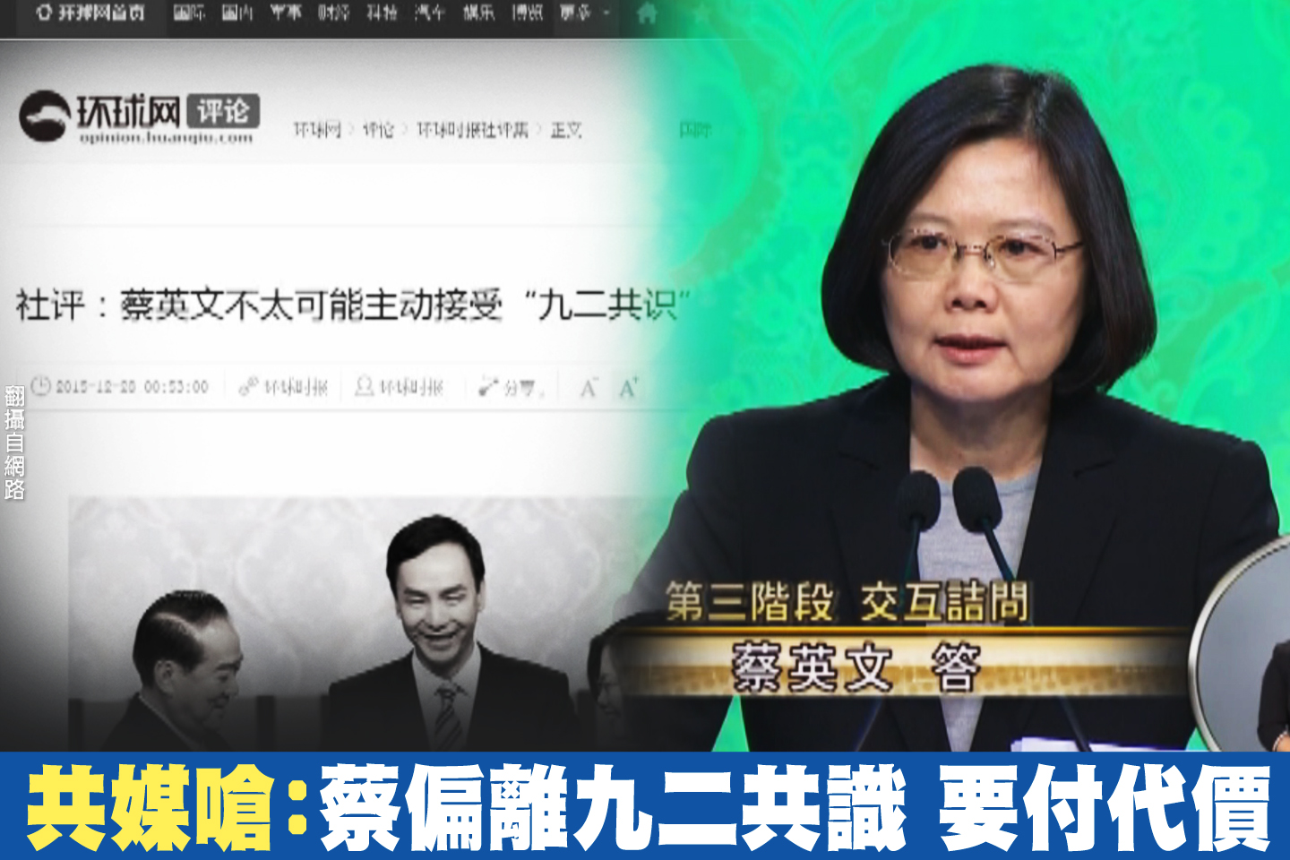 【新唐人亞太台 2015 年 12 月 29 日訊】外媒關注,朱立倫、蔡英文的兩岸政策辯論,而中共官媒《環球時報》昨天是對蔡英文施壓,《環球時報》發表社論,批評蔡英文對於九二共識站在既不承認也不否認的模糊位置上,還說,中共將迫使蔡英文向「九二共識」靠近,「她只要偏離一步,就要付出一分代價」,消息再次引發爭議反彈。