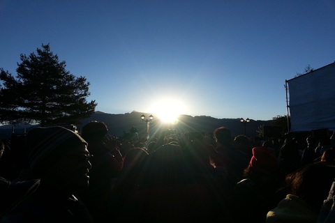 2015-01-01 21:15:09迎日出的代表景點,海拔2500公尺的阿里山,今天曙光出現在7點,雖然現場低溫不到四度,但仍然湧入一萬多名遊客,感受美景與高山音樂會。