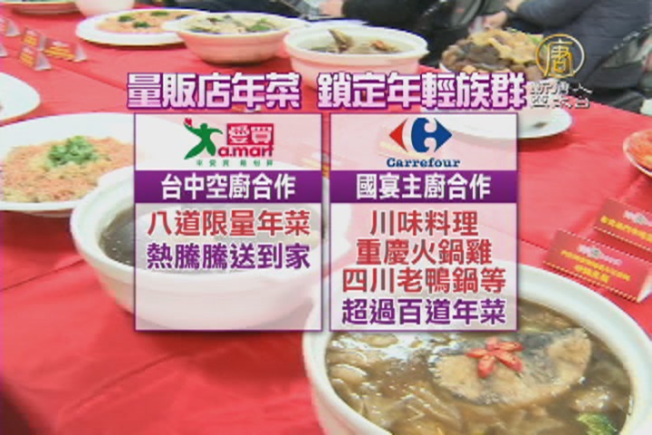 【新唐人亞太台 2015 年 12 月 29 日訊】搶攻20億圍爐商機,量販業者搶攻年輕族群,推出熱騰騰的年菜送到家服務,還有受年輕人喜愛的川味料理,讓民眾在家輕鬆就能享受年菜。