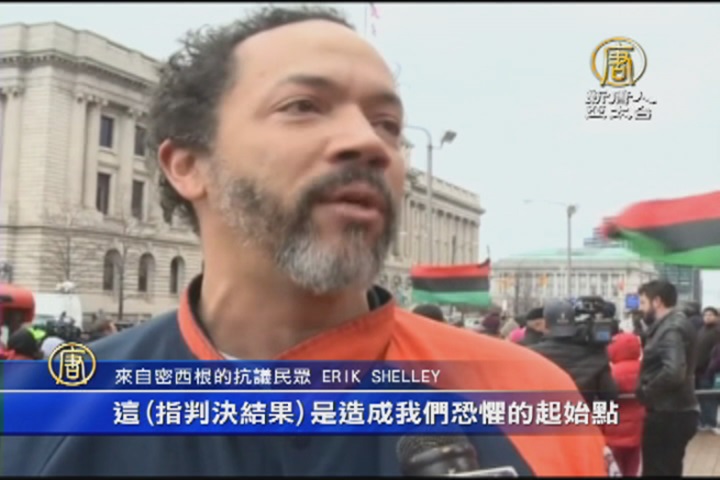 來自密西根的抗議民眾 ERIK SHELLEY:「我們必須讓大家知道,這樣的結果是不被接受的,(檢察官)麥金蒂必須辭職,如果這就是他的工作,(我想)他最好別繼續做這個工作。這(指判決結果)是造成我們恐懼的起始點,我們在此必須阻止,否則它(指類似事件)將有可能發生在密西根、發生在底特律、發生在芝加哥、發生在巴爾的摩。」