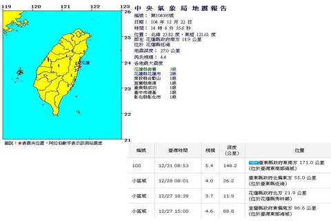 【新唐人亞太台 2015 年 12 月 31 日訊】本週東海岸地震頻傳達4次之多,今早8點53分東海岸地震芮氏規模5.4地震,中央氣象局觀測素示,震央在台東縣政府東南方171公里,深度達148公里,距離台灣稍遠全台有感。