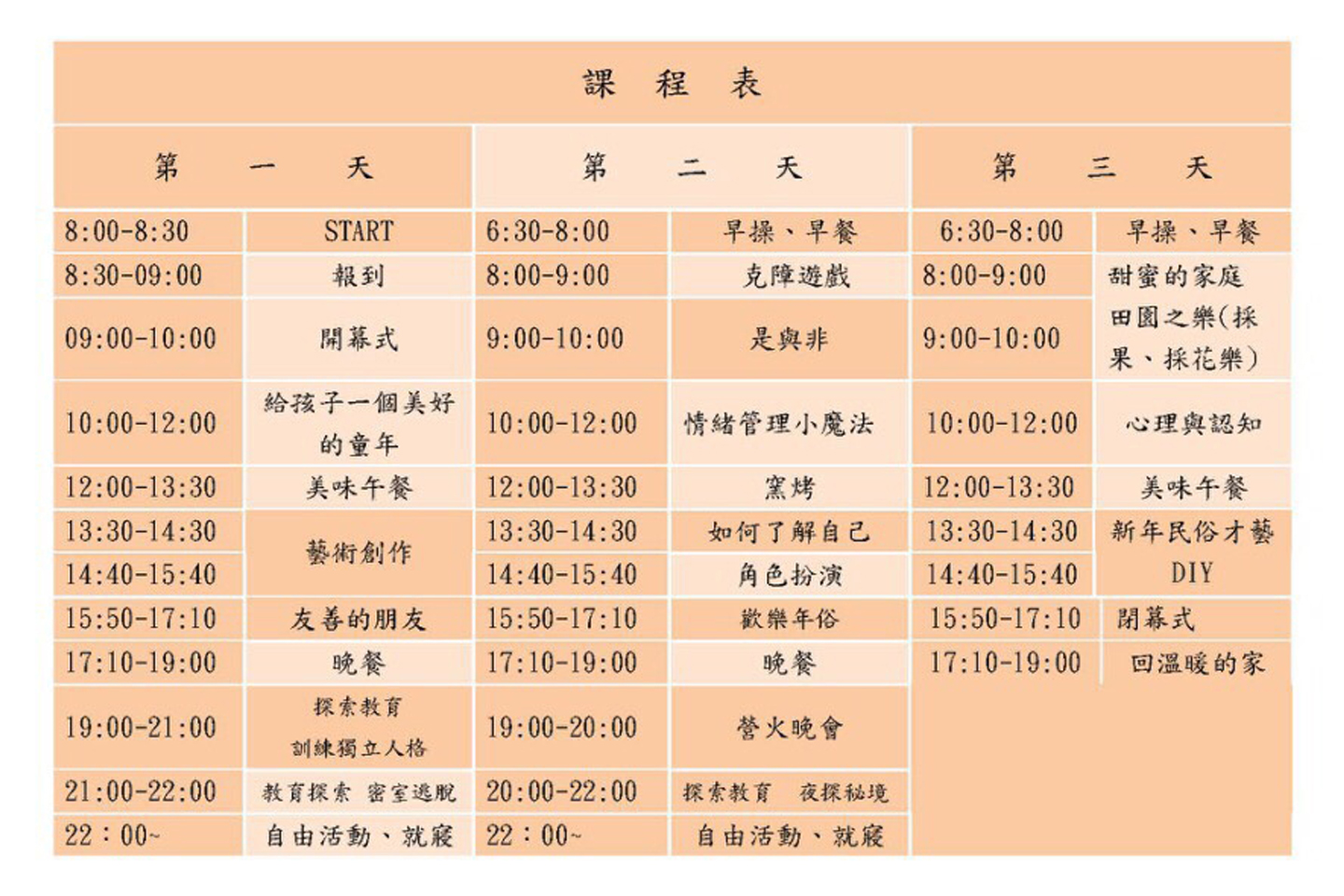 105年新年快樂兒少心性成長營 課表。(台灣傳統基金會提供)