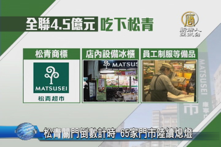 【新唐人亞太台 2015 年 12 月 31 日訊】現行超商通路龍頭 全聯,11月併下松青,展店家數可望突破800家,零售觸角直逼對手統一超商;不過,相關仍有變數,因為目前併購案件卡關公平會,如果認定為獨佔,可能交易破局。不過,現行松青超市,今天晚上11點鐘,有65家營業據點,將陸續結束營運。