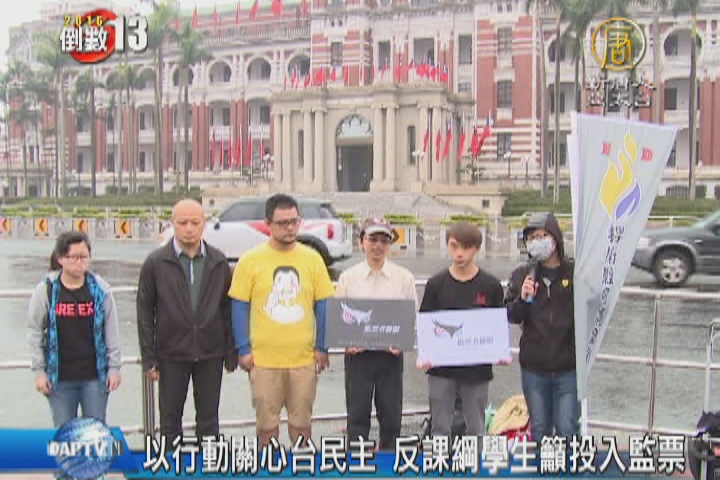 【新唐人亞太台 2016 年 01 月 03 日訊】反課綱運動落幕,學生持續以行動關心社會議題,投入監票行動。由反課綱學生成立的捍衛教育青年陣線,與多個民間團體,今天在凱道召開記者會,號召青少年投入監票行動,避免政客操作選舉結果,杜絕舞弊行為。