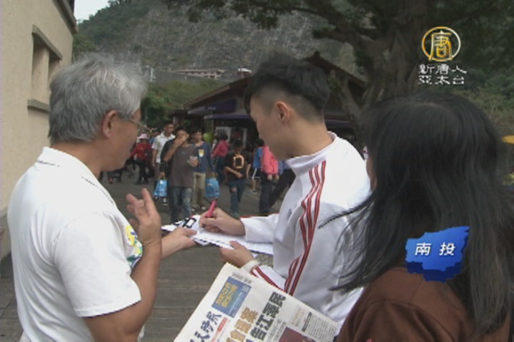 法輪功學員手拿著真相資料,向來往遊客,講述江澤民血腥鎮壓法輪功、活摘器官真相,許多民眾也紛紛連署;目前,在南投,已經有一萬三千份連署舉報江澤民,亞洲則有百萬人連署。