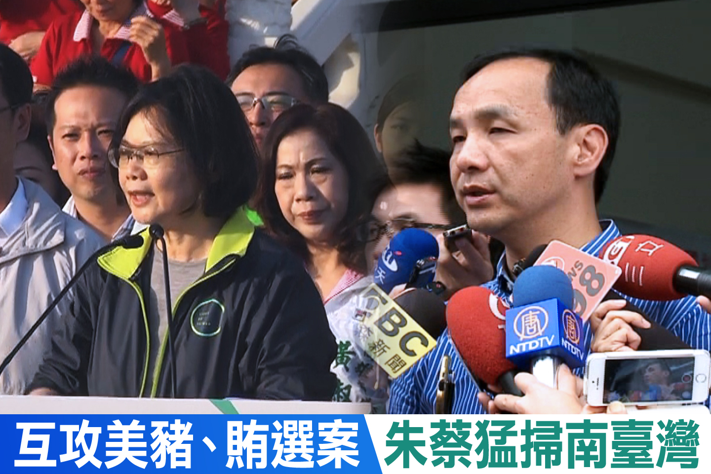 【新唐人亞太台 2016 年 01 月 05 日訊】新聞頭條帶您看到,選戰倒數11天,今天兩黨總統候選人都南下跑行程,朱立倫昨天和今天,連續到養豬戶最多的前兩個地區掃街,猛攻美豬議題,而民進黨也不是省油的燈,接連幾天開記者會,指控對手賄選。