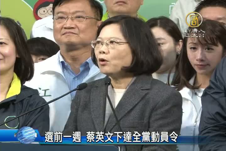 【新唐人亞太台 2016 年 01 月 08 日訊】大選即將進入倒數一週,民進黨總統候選人蔡英文今天(8日)下達全黨動員令,號召民進黨上下全黨公職、志工深入全台,全力催票。